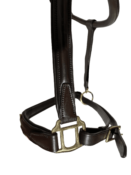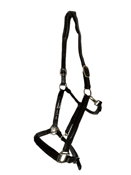 Lovely soft padded leather headcollar with brass fittings, has an anotomic shaped headpieces which buckles both sides, has a clip on the throat lash, and a buckle on the rear of the chin. Sizes available are XL, XXL, XXXL colour brown leather